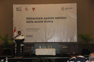 LASKAR – Dalam rangka percepatan perwujudan pengakuan Ambon sebagai Kota Musik Dunia versi UNESCO, Pemerintah Pusat (Pempus) RI melalui Badan Ekonomi Kreatif (BEKraf) melaksanakan Sosialisasi Ambon Menuju Kota Musik Dunia kepada Kepala Desa, Raja, Lurah, Camat, Guru Kesenian dan Pimpinan Sanggar Seni, bertempat di Hotel Santika Premiere Ambon, Rabu (11/7/2018).