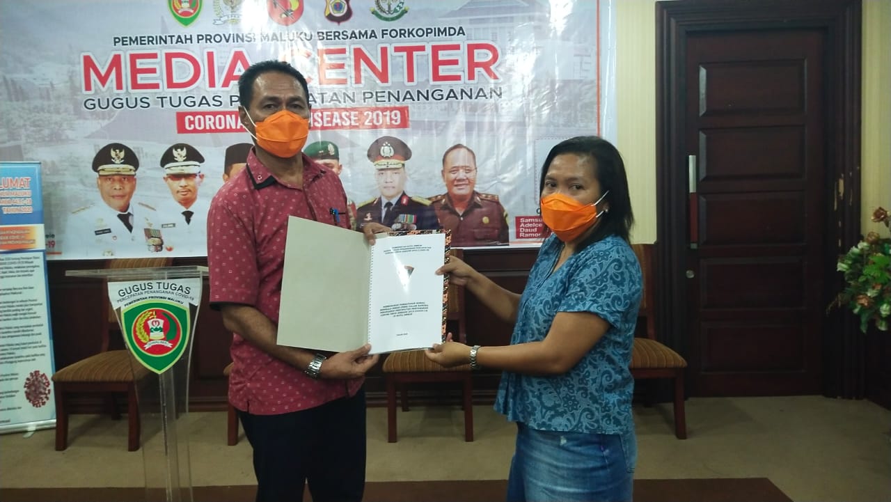 Penyerahan Dokumen PSBB dari Pemerintah Kota Ambon ke Pemerintah Provinsi Maluku berlangsung di Sekretariat Gugus Tugas Percepatan Penanganan Covid-19 Maluku, di lantai 6 Kantor Gubernur Maluku.