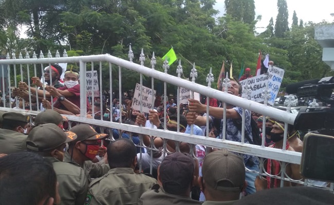 Para pendemo bersikeras ingin bertemu Gubernur Maluku Murad Ismail sehingga terjadi aksi dorong mendorong dengan polisi pamong praja maupun anggota polisi yang tidak mengijinkan para pendemo masuk ke halaman kantor Gubernur Maluku.