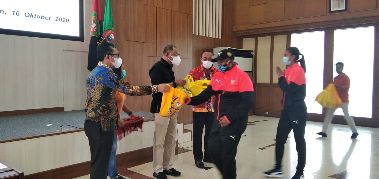 | Ketua KONI Maluku Tonny Pariela saat menyerahkan APB kepada para atlet, Jumat (16/10/2020) |