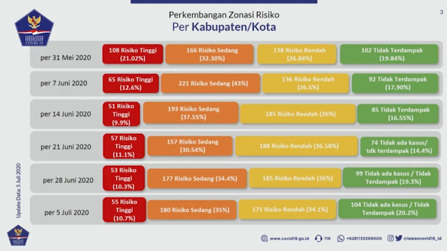 Diketahui, dari 514 Kabupaten/Kota di Indonesia, sebanyak 43 Kabupaten/Kota masuk dalam zona hijau (tidak ada kasus baru), 175 Kabupaten/Kota dengan resiko rendah atau zona kuning, 180 Kabupaten/Kota berada pada resiko sedang dan 55 Kabupaten/Kota dengan resiko tinggi dan 61 Kabupaten/Kota yang tidak terdampak. (L01)