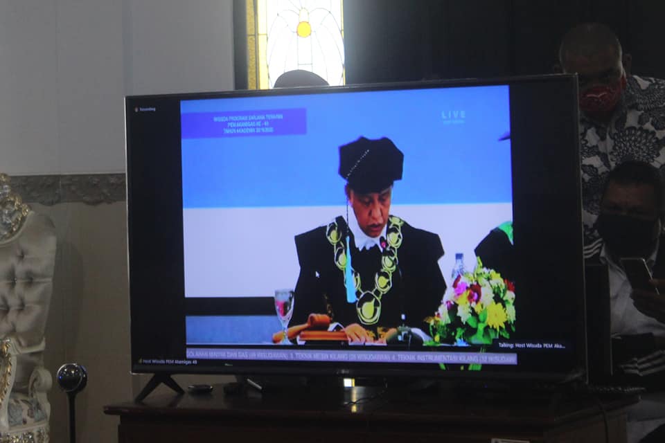 Bupati Kepulauan Tanimbar, Petrus Fatlolon, SH., MH didampingi Asisten Bidang Administrasi Umum dan Kepala BKPSDM Kabupaten Kepulauan Tanimbar, bersama dengan orang tua/ wali dari 9 orang Wisudawan dan Wisudawati PEM AKAMIGAS asal Kabupaten Kepulauan Tanimbar mengikuti prosesi Wisuda Program Sarjana Terapan ke-49 Politeknik Energi dan Mineral AKAMIGAS Tahun Akademik 2019/2020 di Cepu yang dilakukan secara virtual.