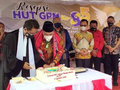 | Gubernur Maluku Murad Ismail dan Ketua Sinode Pdt A.J.S Werinussa saat memotong Kue HUT GPM yang ke-85 |