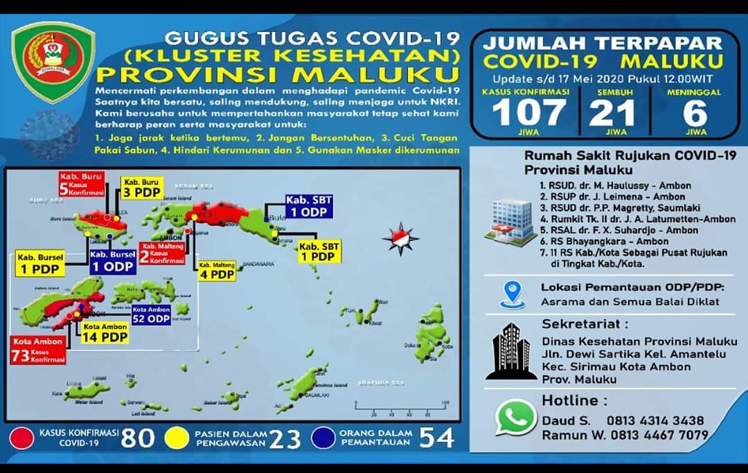 Dari data yang dirilis tim Gugus Tugas Percepatan Penanganan Covid 19 Provinsi Maluku, jumlah pasien kasus positif Covid-19 Provinsi Maluku bertambah 23 orang hinggaa total secara keseluruhan menjadi 107 orang, 21 telah dinyatakan sembuh dan 6 orang meninggal dunia, sementara 80 orang sementara menjalani perawatan di sejumlah rumah sakit.