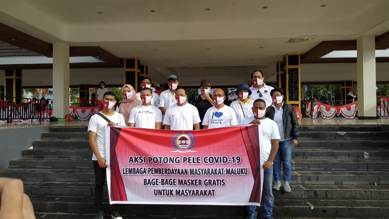 Prihatin dengan sikap masyarakat yang masih enggan menggunakan masker saat keluar rumah. Lembaga Pemberdaaan Masyarakat (LPM) Provinsi Maluku yang dipimpin langsung Ketua LPM Maluku Drs.Jasmono,M.Si mengkampanyekan dan mensosialisasikan potong pele Covid-19 (pencegahan-red) melalui aksi bagi-bagi masker gratis sebanyak 2000 masker kepada masyarakat Kota Ambon.