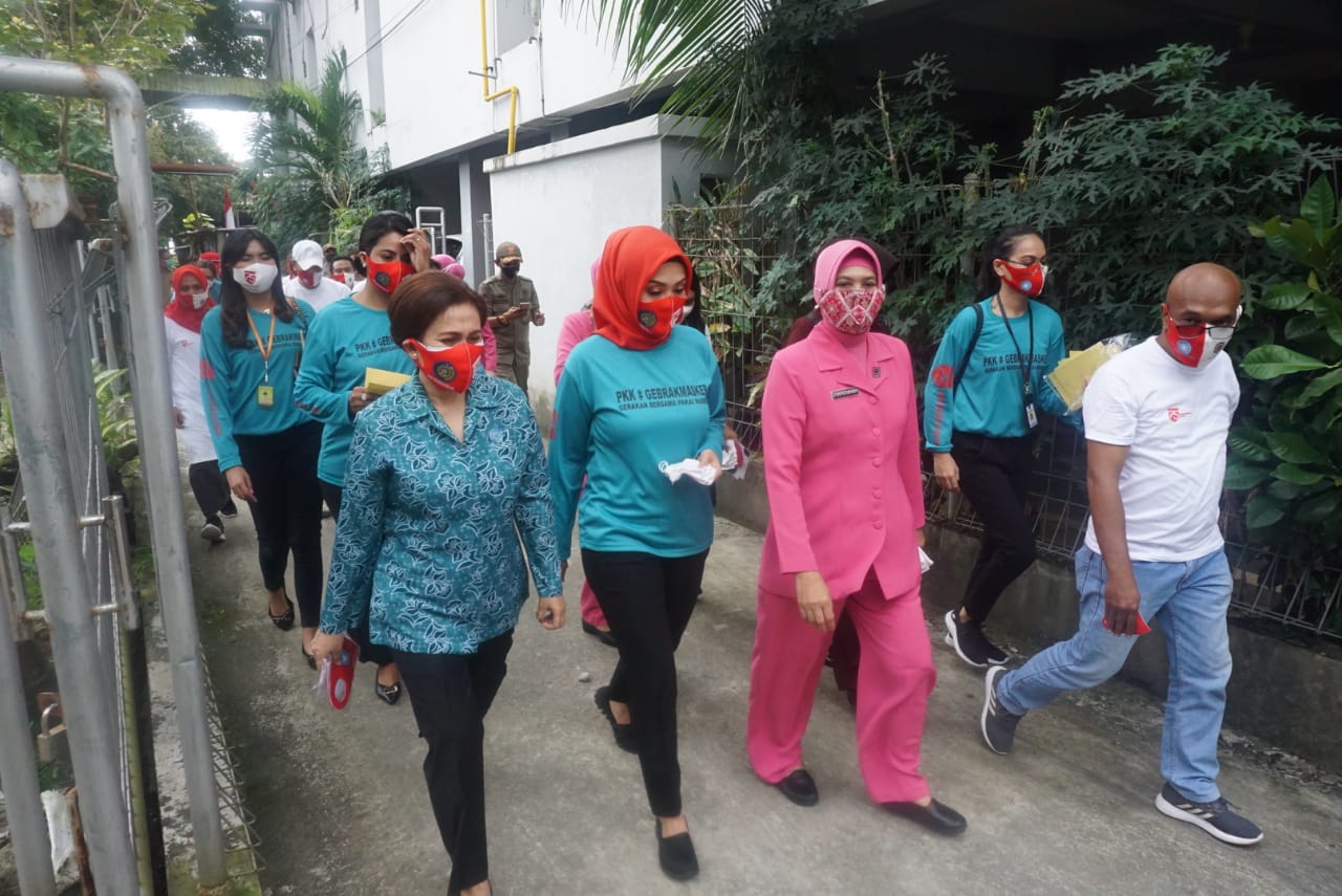 LASKAR – Sukseskan Aksi Gebrak Masker Nasional dalam memperingati Hari Kemerdekaan ke-75 RI, Tim penggerak PKK Provinsi Maluku bekerjasama dengan TP PKK Kota Ambon, Ikatan Keluarga Perguruan Tinggi Praja (IKAPTK) dan Bhayangkari Polda Maluku, membagikan masker door to door disejumlah Kelurahan/Desa/Negeri di Kota Ambon, Senin (17/08/2020).
