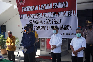 | Walikota Ambon Richard Louhenapessy, SH saat memberikan sambutan pada acara penyerahan 5000 paket sembako dari Presiden RI, Minggu (10/05/2020) di Halaman Balai Kota |