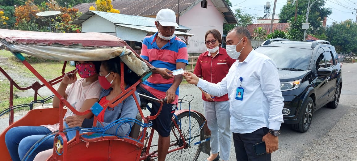 | Pimpinan PT.Bank Maluku dan Malut Cabang Piru, Jhon Neddy Effendy saat memberikan kupon sembako kepada tukang becak |