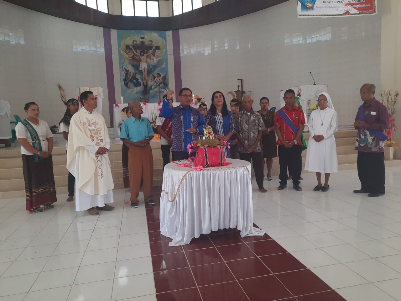 Berbusana biru khas Tanimbar, Bupati Petrus Fatlolon bersama istri diminta untuk meniup lilin dengan angka 53 di atas cake HUT yang sudah disediakan pastor paroki dan umat dalam suasana kesederhanaan.