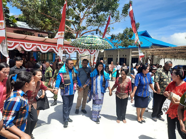 | Penyambutan Bupati Kepulauan Tanimbar etrus Fatolon, SH,MH bersama istri di Desa Arui Bab, Minggu (16/08/2020) |