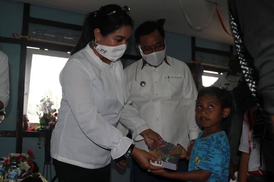 | Ketua TP PKK, Ibu Joice Fatlolon membagikan buku dan alat tulis kepada siswa |