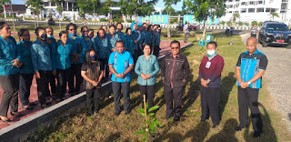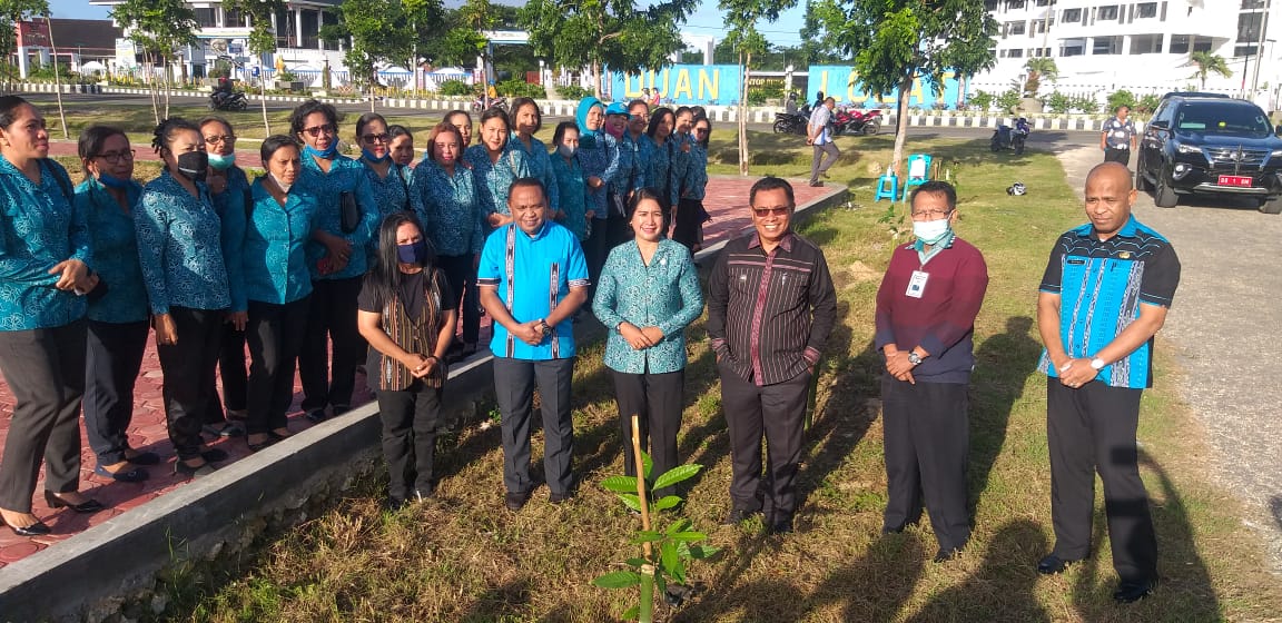 | Ketua TP PKK KKT Joice Fatlolon saat melakukan penghijauan dengan menanam anakan pohon Mahoni di sekitar lokasi Taman Baca dan Taman Bermain Ramah Anak di Taman Kota Saumlaki. |