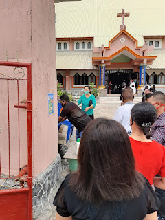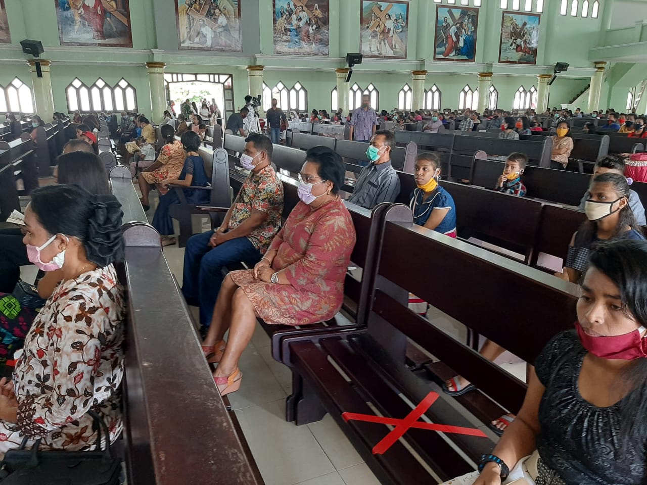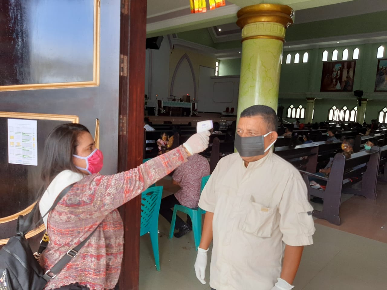 Sebelum mamasuki gedung gereja, umat diwajibkan menggunakan masker, mencuci tangan di depan gereja, mengukur suku tubuh, dan duduk menggunakan jarak.