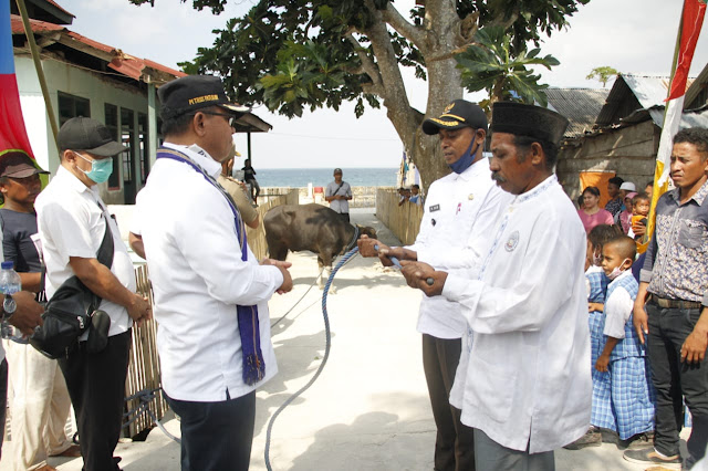 LASKAR – Jelang perayaan Hari Raya Kurban “Idul Adha” 1441 H/2020 M yang jatuh pada tanggal 31 Juli 2020, Bupati Kepulauan Tanimbar Petrus Fatlolon, SH. MH dalam rangkaian kunjungan kerjanya di Kecamatan Wuar Labobar pada tanggal 29 Juli 2020, menyerahkan empat ekor sapi kepada umat Muslim di empat desa masing-masing Desa Karatat, Desa Kilon, Desa Labobar dan Desa Persiapan Namralan.