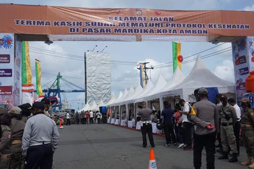 LASKAR – Pasar Mardika, resmi menjadi kawasan percontohan tertib protokol kesehatan yang bertujuan untuk menekan penyebaran Covid-19. Suatu Gaya hidup baru dengan pola pendekatan yang benar dari aspek kesehatan.