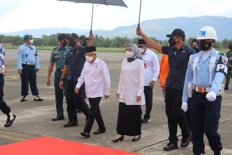 LASKAR – Berbusana putih Wakil Presiden (Wapres) Ma’ruf Amin didampingi sang istri, Wury Ma’ruf Amin, Wapres tiba di Bandara Pattimura, Rabu (13/10/2021) sekitar pukul 12.30 WIT dengan menggunakan pesawat khusus Kepresidenan Boeing 737-400 TNI AU dan disambut Gubernur Maluku Murad Ismail bersama istri Widya Murad serta unsur Forum Komunikasi Pimpinan Daerah (Forkopimda) Maluku.