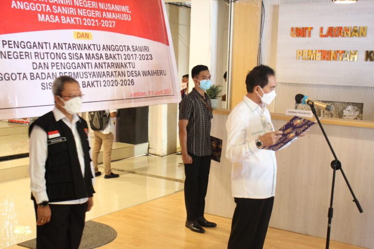 LASKAR – Wakil Walikota (Wawali) Ambon, Syarif Hadler, meresmikan anggota Saniri Negeri Nusaniwe dan Negeri Amahusu masa bakti 2021-2021, Pengganti Antar Waktu (PAW) anggota Saniri Negeri Rutong sisa masa bakti 2017-2023 serta PAW Badan Permusyawaratan Desa (BPD) Waiheru, sisa masa bakti 2020-2026, Jumat (11/6/2021), bertempat di Unit Layanan Administrasi (ULA) Balai Kota Ambon.