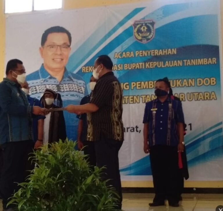 LASKAR – Bupati Kepulauan Tanimbar Petrus Fatlolon, SH,MH mendorong pembentukan Daerah Otonom Baru (DOB) Kabupaten Tanimbar Utara, dengan menyerahkan rekomendasi usulan kepada penjabat Sekda Kabupaten Kepulauan Tanimbar (KKT) Ruben Moriolkosu.