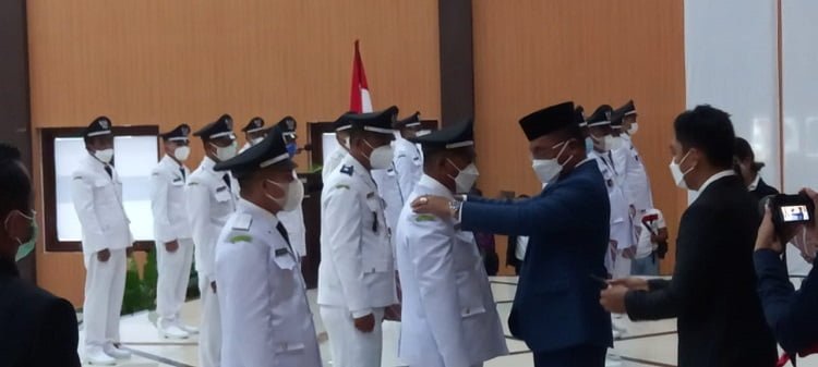 LASKAR – Bupati Kepulauan Tanimbar Petrus Fatlolon, SH,MH melantik 17 kepala desa terpilih periode 2021 – 2027 hasil pemilihan kepala desa (Pilkades) serentak tahun 2021 di Gedung Kesenian Saumlaki, Ibukota Kabupaten KKT, Selasa (06/04/2021).