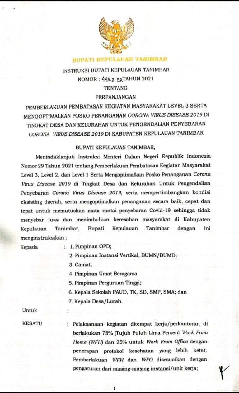 Instruksi yang ditandatangani tanggal 3 Agustus 2021 ini juga untuk mengoptimalkan Satuan Tugas Penanganan Covid-19 di Kepulauan Tanimbar pada tempat peribadatan, tempat usaha, kantor dan sebagaianya dalam upaya untuk memutus mata rantai penyebaran Covid-19. (L03)