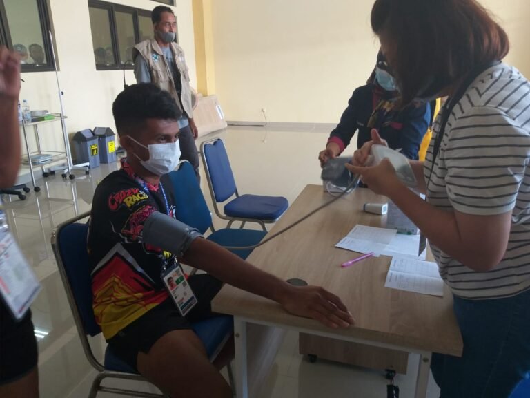 LASKAR – Para atlet Muaythai Maluku menjalani pemeriksaan kesehatan menjelang dimulainya pertandingan Pekan Olahraga Nasional (PON) XX/2021-Papua yang akan digelar Senin (27/09/2021).