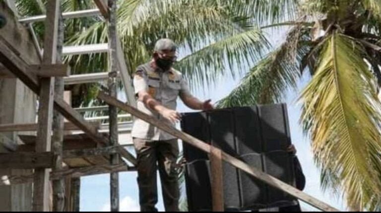 Buktinya, Bupati turun langsung membantu warga memasang atap gereja baru jemaat GPM Ohoidertawun, Kamis (15/04/2021).