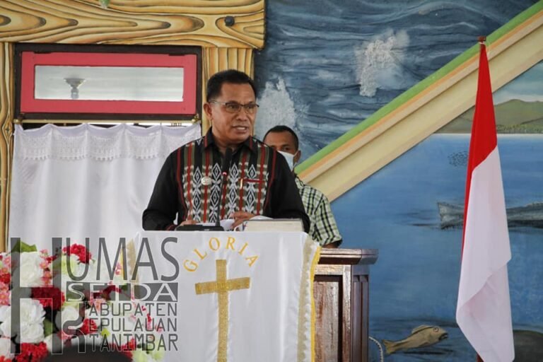 LASKAR – Bupati Kepulauan Tanimbar Petrus Fatlolon, SH,MH memberikan apresiasi kepada pemangku adat dan Jemaat GPM Lelingluan atas penyambutan dan perayaan pembukaan Sidang Klasis Tanimbar Utara Ke-40, Minggu (09/05/2021) karena menampilkan nuansa adat dan tenun Tanimbar