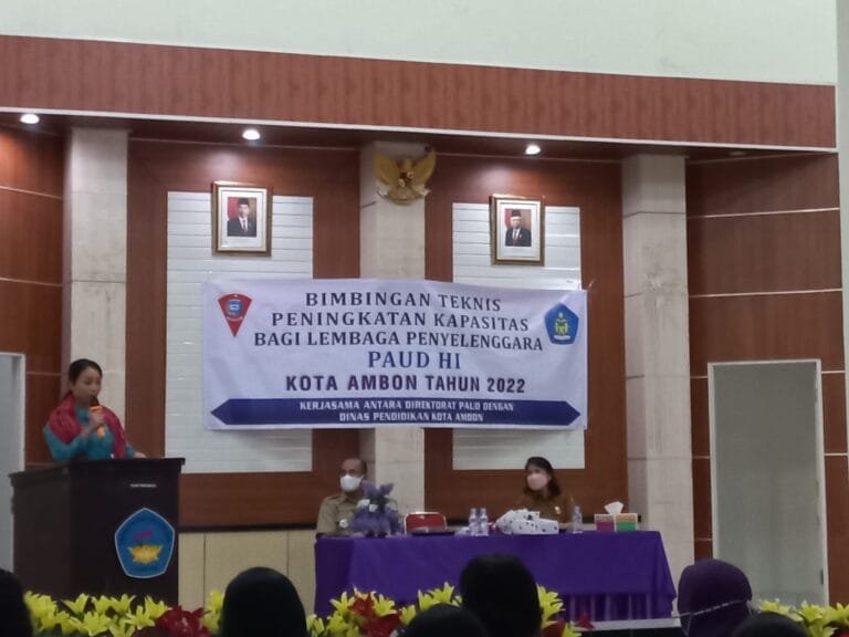 “Inilah tugas dan tanggung jawab kita dalam mencerdaskan generasi emas yang hebat. Sesuai dengan Peraturan Presiden nomor 60 Tahun 2023 yang membahas tentang Pengembangan Anak Usia Dini Holistik Integratif, dimana sebagai bentuk komitmen Pemerintah dalam menjamin terpenuhinya harus tumbuh kembang anak dalam hal pendidikan, kesehatan, gizi, perawatan, pengasuhan, serta perlindungan dan kesejahteraan anak,”ungkapnya saat memberikan sambutan pada kegiatan Bimbingan Teknis Peningkatan Kapasitas Bagi Lembaga Penyelenggara PAUD HI Tahun 2022, Senin (15/08/2022) di aula PGSD Ambon.