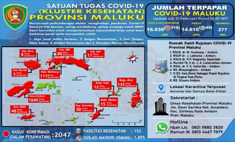LASKAR – Data Gugus Tugas Covid-19, Provinsi Maluku, Sabtu (12/2/2022) penambahan kasus konfirmasi 319 kasus, total 16.939 Kasus.