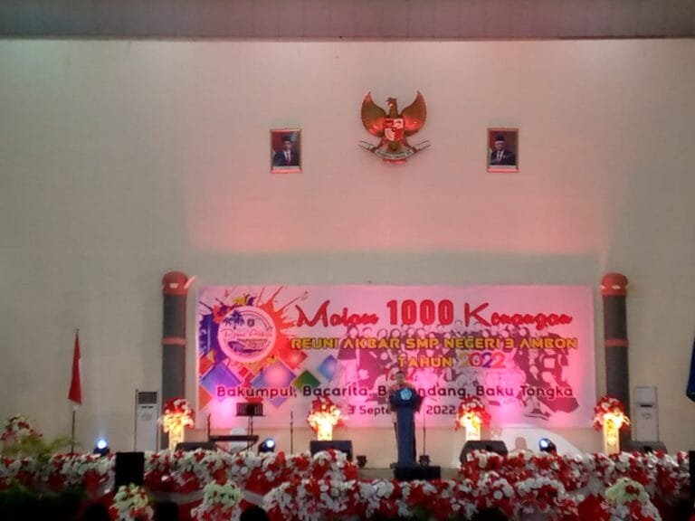 LASKAR – Malam 1000 Kenangan Reuni Akbar SMPN 3 Ambon Tahun 2022 Dengan Tema “Berkumpul Bacarita, Badendang, Bakutongka, di gelar Auditorium Unpatti dalam rangka HUT SMP Negeri 3 Ambon ke-67, Sabtu (3/9/2022) Malam.