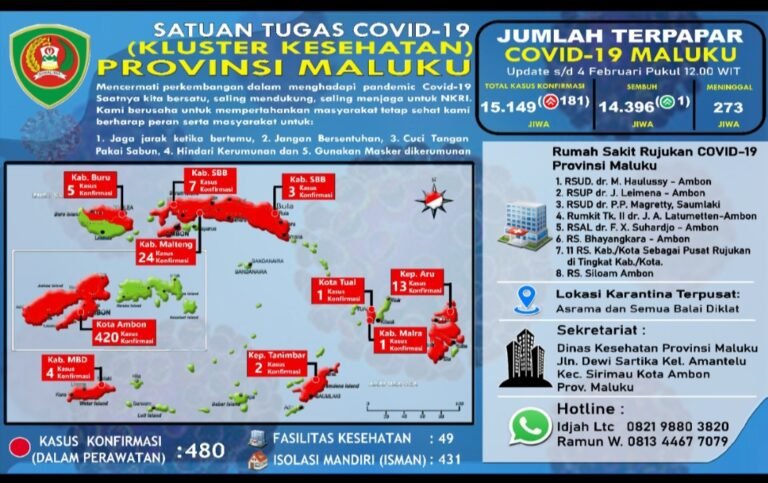 “Dengan adanya penambahan tersebut, maka total kasus aktif kini mencapai 480 kasus dengan jumlah seluruhya 15.149 ,” jelas Juru bicara Gugus tugas (Gustu) Covid-19 Maluku Dr Adonya Rerung dalam rilisnya Jumat (4/2/2022)
