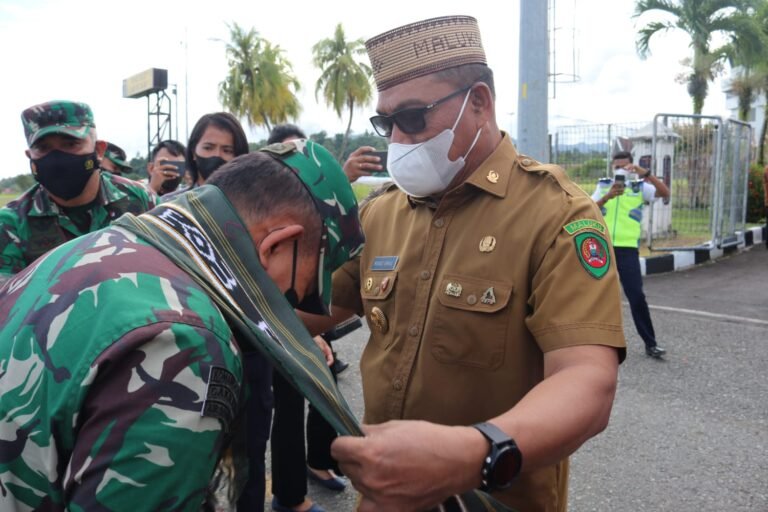 LASKAR – Gubernur Provinsi Maluku Irjen Pol (Purn) Murad Ismail bersama istri Ibu Widya Pratiwi Murad, menyambut kedatangan Kepala Staf Angkatan Darat (KSAD) Jenderal TNI Dudung Abdurachman dan istri Ibu Rahma Dudung Abdurachman di VIP Room Bandara Udara Internasional Pattimura Ambon, Selasa, (12/04/2022).