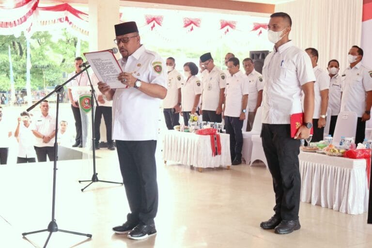 LASKAR– Gubernur Maluku Murad Ismail mengambil sumpah / janji 328 Pegawai Negeri Sipil (PNS), di Tribun Lapangan Merdeka, Rabu, (29/06/2022). Tak hanya mengambil sumpah, kepala daerah juga menyerahkan SK PNS kepada enam perwakilan pegawai dan membuka Rapat Kerja (Raker) Kepegawaian Provinsi Maluku Tahun 2022.