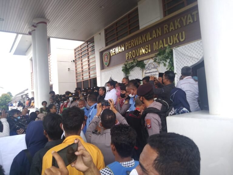 Aksi berlangsung di kantor DPRD Maluku, dan di kawal ketat oleh pihak aparat Kepolisian Polda Maluku, Senin (11/4/2022).