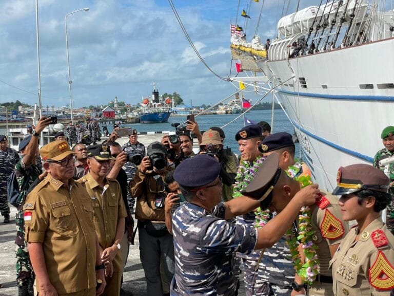 LASKAR – Komandan Lanal Tual, Kolonel Laut (P) Indra Dharma, S.E., M.Tr. Hanla menyambut kedatangan Kapal KRI Bima Suci-945 di Kepulauan Kei.