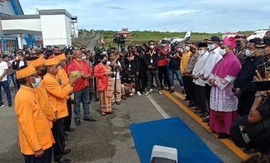 Usai diterima dengan proses adat, dari bandara Uskup Seno Ngutra dikawal ketat oleh aparat keamanan, GP Ansor Maluku Tenggara, AMGPM serta diiring-iring oleh umat Katolik menuju Unio Projo Langgur.