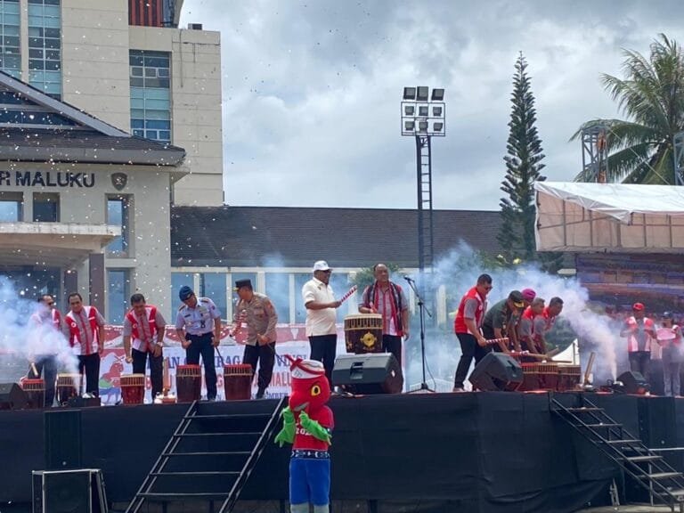 LASKAR – Pembukaan Pekan Olahraga Provinsi Maluku (Popmal) IV, ditandai dengan Pemukulan Tifa Oleh, Gubenur Maluku Murad Ismail dan Ketua Umum KONI Pusat Letjen (Purn) Marciano Norman