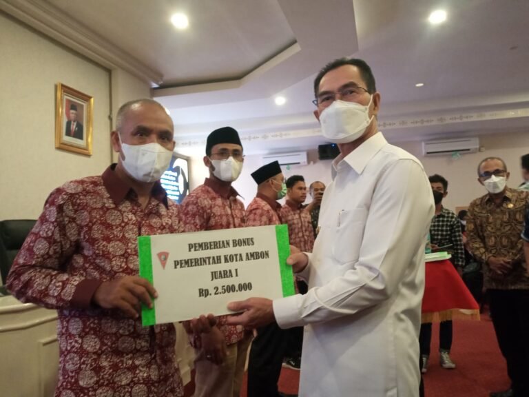 LASKAR – Pemerintah Kota Ambon memberikan bonus kepada anggota kafilah Kota Ambon, yang telah berhasil menjadi juara pada Musabaqah Tilawatil Quran (MTQ) Tingkat Provinsi Maluku di Saumlaki, Kabupaten Kepulaun Tanimbar (KKT), 16 – 24 Maret 2022 lalu, kafilah Kota Ambon meraih posisi Juara Umum III.