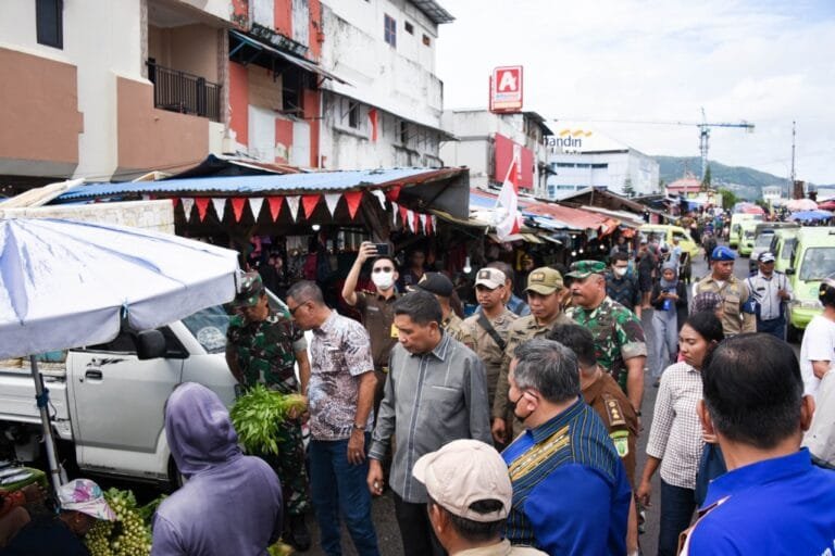 LASKAR – Sejumlah pejabat Kodam XVI/ Pattimura, seperti Aster Kasdam XVI/ Pattimura Kolonel Inf Chrisbianto Arimurti, Kasiter Korem 151/ Binaiya Kolonel Inf D.C. Soumokil, Pa Ahli Bidang Mansishaneg Kolonel Czi Achmad Yussa dan Pabandya Komsos Mayor Inf Rolando bersama Walikota Ambon, Kepala Dinas Perdagangan, Kepala Dinas Pertanian dan sejumlah pejabat lainnya melakukan inspeksi mendadak ke sejumlah pasar di Kota Ambon, Selasa (06/09/2022).