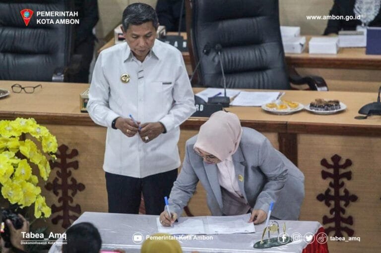 LASKAR – Pemerintah Kota (Pemkot) Ambon bersama dengan Dewan Perwakilan Rakyat Daerah (DPRD) melaksanakan penandatanganan Rancangan Peraturan Daerah (Ranperda) tentang Anggaran Pendapatan dan Belanja Daerah (APBD) T. A 2023 menjadi Peraturan Darah (Perda).