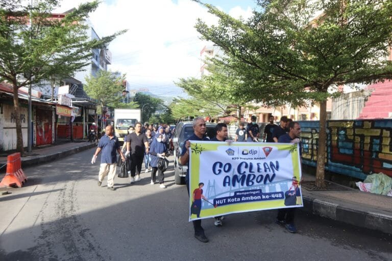 AMBON, LaskarMaluku.com – Kantor Pelayanan Pajak Pratama Ambon, menggelar aksi jalan sehat dan bersih lingkungan dalam rangka menyongsong perayaan HUT Kota Ambon yang ke-448 tahun pada 7 September mendatang yang difokuskan pada ruas jalan pusat Kota Ambon, pada Jumat (1/9/2023).