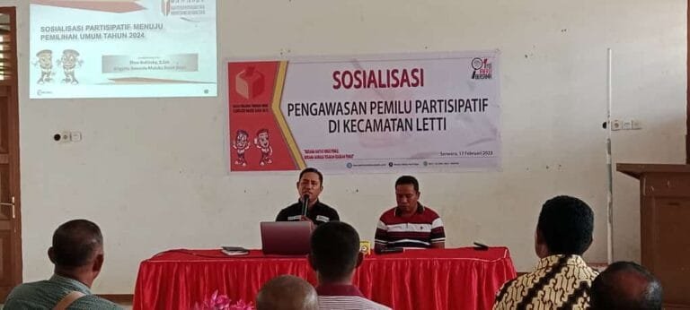 Menyikapi hal ini, Badan Pengawas Pemilu Kabupaten Maluku Barat Daya melakukan sosialisasi Pengawasan Pemilu Partisipatif. Kegiatan yang dilakukan di Kecamatan Leti, (17/2/2023) melibatkan Tokoh Masyarakat (Kepala Desa) se-Kecamatan Leti, Tokoh Pemuda dan Tokoh Agama serta Pengawas Kelurahan Desa, staf dan pimpinan Panwascam.