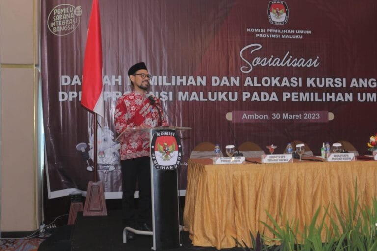 AMBON, LaskarMaluku.com – KPU Provinsi Maluku menggelar, kegiatan sosialisasi tentang Daerah Pemilihan dan Alokasi Kursi Anggota DPR dan DPRD Provinsi Maluku pada Pemilu Tahun 2024, di Swiss-Belhotel Ambon, Kamis (30/3/2023) sore.