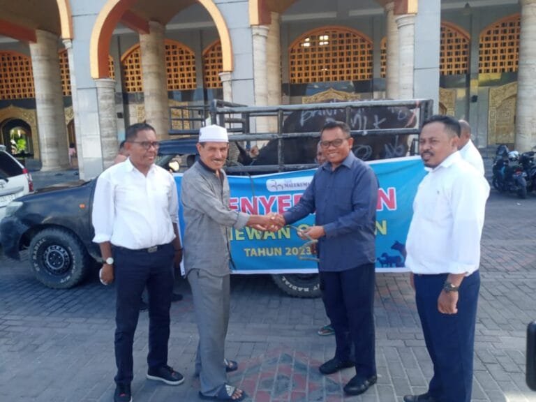 “Jadi, dalam rangka menyambut Idul Adha 1444 Hijriah 2023 PT Bank Pembangunan Daerah Maluku dan Maluku Utara (Perseroan) menyerahkan belasan ekor hewan kurban kepada sejumlah Masjid di Maluku,”jelasnya.