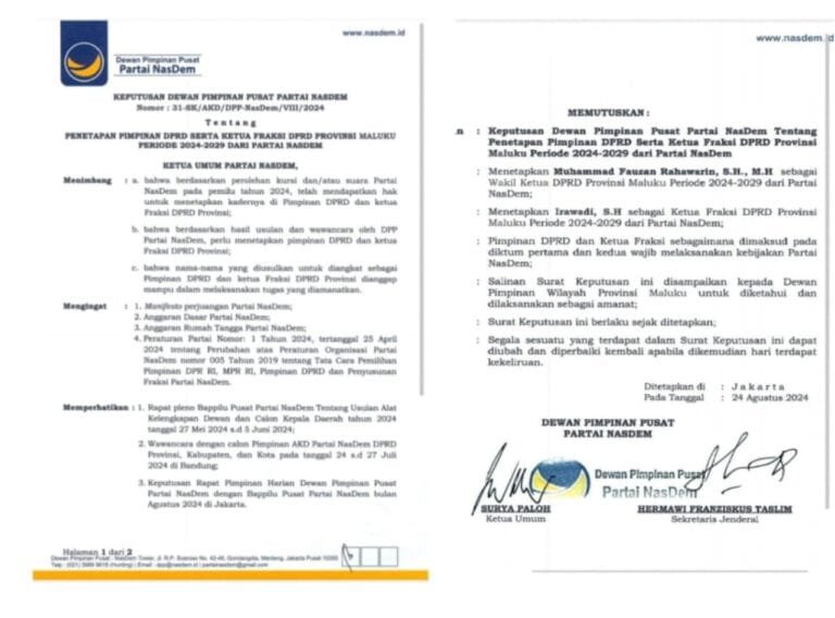AMBON, LaskarMaluku.com – Akhirnya Tarik menarik jabatan Wakil Ketua DPRD Maluku dari Partai NasDem terjawab sudah. Dewan Pimpinan Pusat (DPP) telah mengeluarkan Surat Keputusan Nomor : 31-SK/AKD/DPP-NasDem/VIII/2024 tentang penetapan pimpinan DPRD serta Ketua Fraksi DPRD Maluku periode 2024-2029.