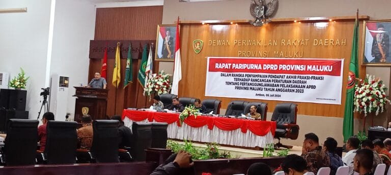 AMBON, LaskarMaluku.com – Dewan Perwakilan Rakyat Daerah (DPRD) Provinsi Maluku menggelar rapat sidang paripurna penyampaian pendapat akhir Fraksi-Fraksi terhadap Rancangan Peraturan Daerah (Ranperda) tentang pertanggungjawaban pelaksanaan Anggaran Pendapatan dan Belanja Daerah (APBD) Tahun 2023.