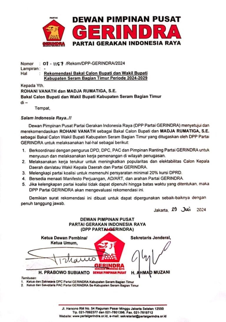 Khusus untuk SBT, DPP Gerindra mengeluarkan Rekomendasi kepada bakal calon Bupati Kabupaten Seram Bagian Timur SBT Ibu Rohani Vanath dan Madja Rumahtiga sebagai bakal calon wakil bupati.