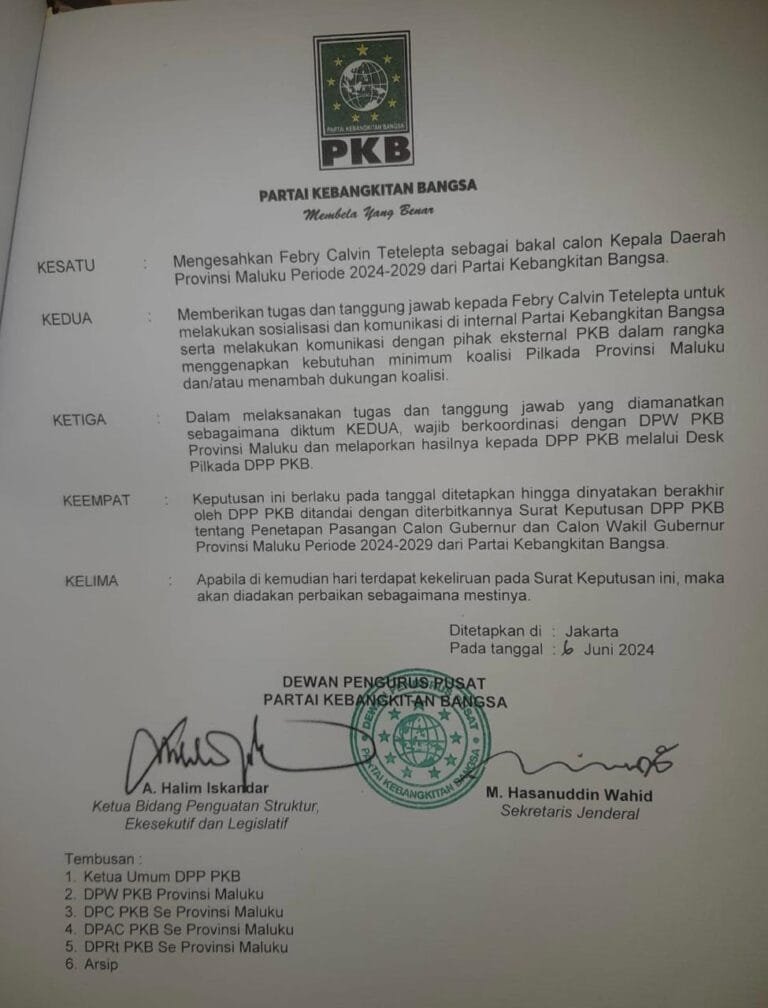 Surat keputusan Dewan Pengurus Pusat Partai Kebangkitan Bangsa ini merupakan Surat tugas penetapan tahap I dari DPP PKB kepada FCT sebagai bakal calon kepala daerah Provinsi Maluku periode 2024-2029.