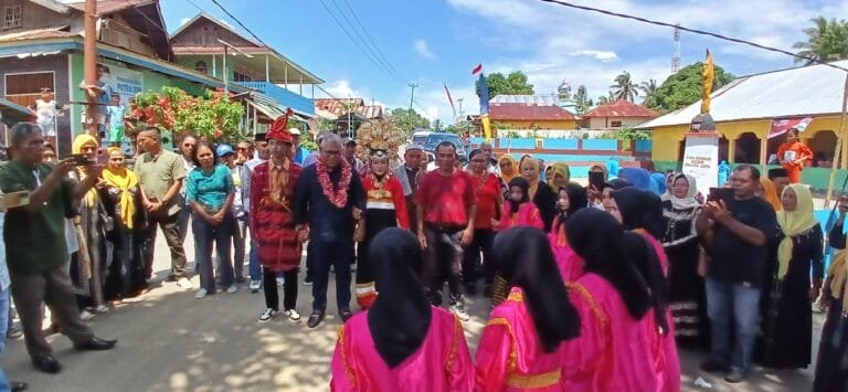 Tetelepta disambut kepala-kepala dusun dan tari-tarian dari kaum ibu dan anak-anak dari jalan raya menuju Baileo Pemuda Turbo Pelita Jaya di Jalan Dusun Pelita Jaya, Desa Eti.