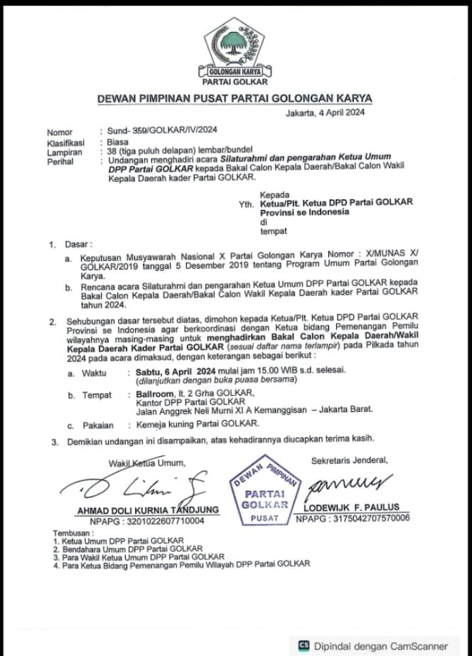 Undangan tersebut sesuai dengan surat dari DPP Partai Golkar nomor Sund-359/GOLKAR/IV/2024, tertanggal 4 April yang ditujukan kepada Ketua/Plt Ketua DPD Partai Golkar se-Indonesia.